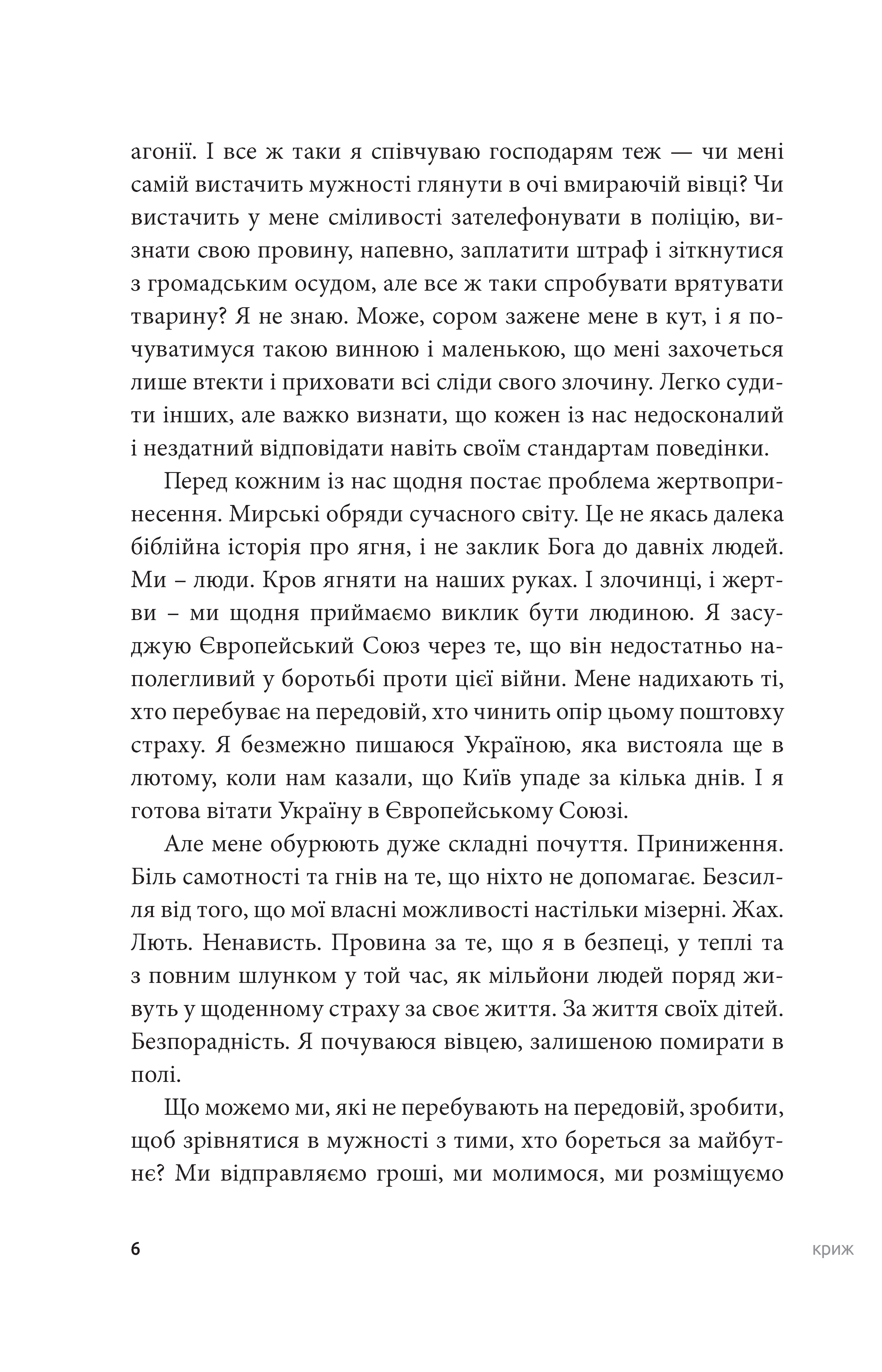 Але мене обурюють дуже складні почуття. Приниження. Біль самотності та гнів на те, що ніхто не допомагає. Безсилля від того, що мої власні можливості настільки мізерні. Жах. Лють. Ненависть. Провина за те, що я в безпеці, у теплі та з повним шлунком у той час, як мільйони людей поряд живуть у щоденному страху за своє життя. За життя своїх дітей. Безпорадність. Я почуваюся вівцею, залишеною помирати в полі.
