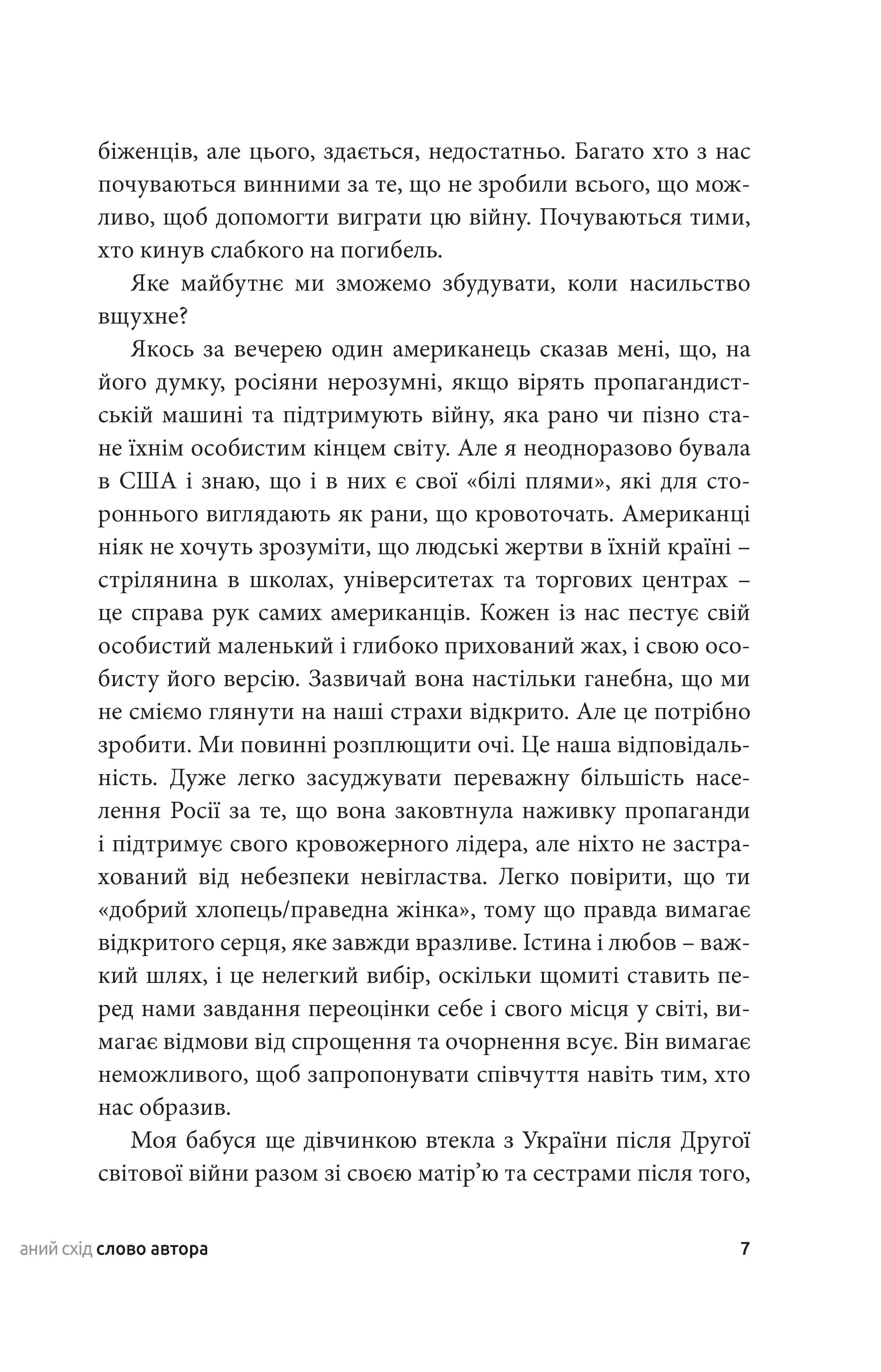 Якось за вечерею один американець сказав мені, що, на його думку, росіяни нерозумні, якщо вірять пропагандистській машині та підтримують війну, яка рано чи пізно стане їхнім особистим кінцем світу. Але я неодноразово бувала в США і знаю, що і в них є свої «білі плями», які для стороннього виглядають як рани, що кровоточать. Американці ніяк не хочуть зрозуміти, що людські жертви в їхній країні – стрілянина в школах, університетах та торгових центрах – це справа рук самих американців. Кожен із нас пестує свій особистий маленький і глибоко прихований жах, і свою особисту його версію. Зазвичай вона настільки ганебна, що ми не сміємо глянути на наші страхи відкрито. Але це потрібно зробити. Ми повинні розплющити очі. Це наша відповідальність. Дуже легко засуджувати переважну більшість населення Росії за те, що вона заковтнула наживку пропаганди і підтримує свого кровожерного лідера, але ніхто не застрахований від небезпеки невігластва. Легко повірити, що ти «добрий хлопець/праведна жінка», тому що правда вимагає відкритого серця, яке завжди вразливе. Істина і любов – важкий шлях, і це нелегкий вибір, оскільки щомиті ставить перед нами завдання переоцінки себе і свого місця у світі, вимагає відмови від спрощення та очорнення всує. Він вимагає неможливого, щоб запропонувати співчуття навіть тим, хто нас образив.