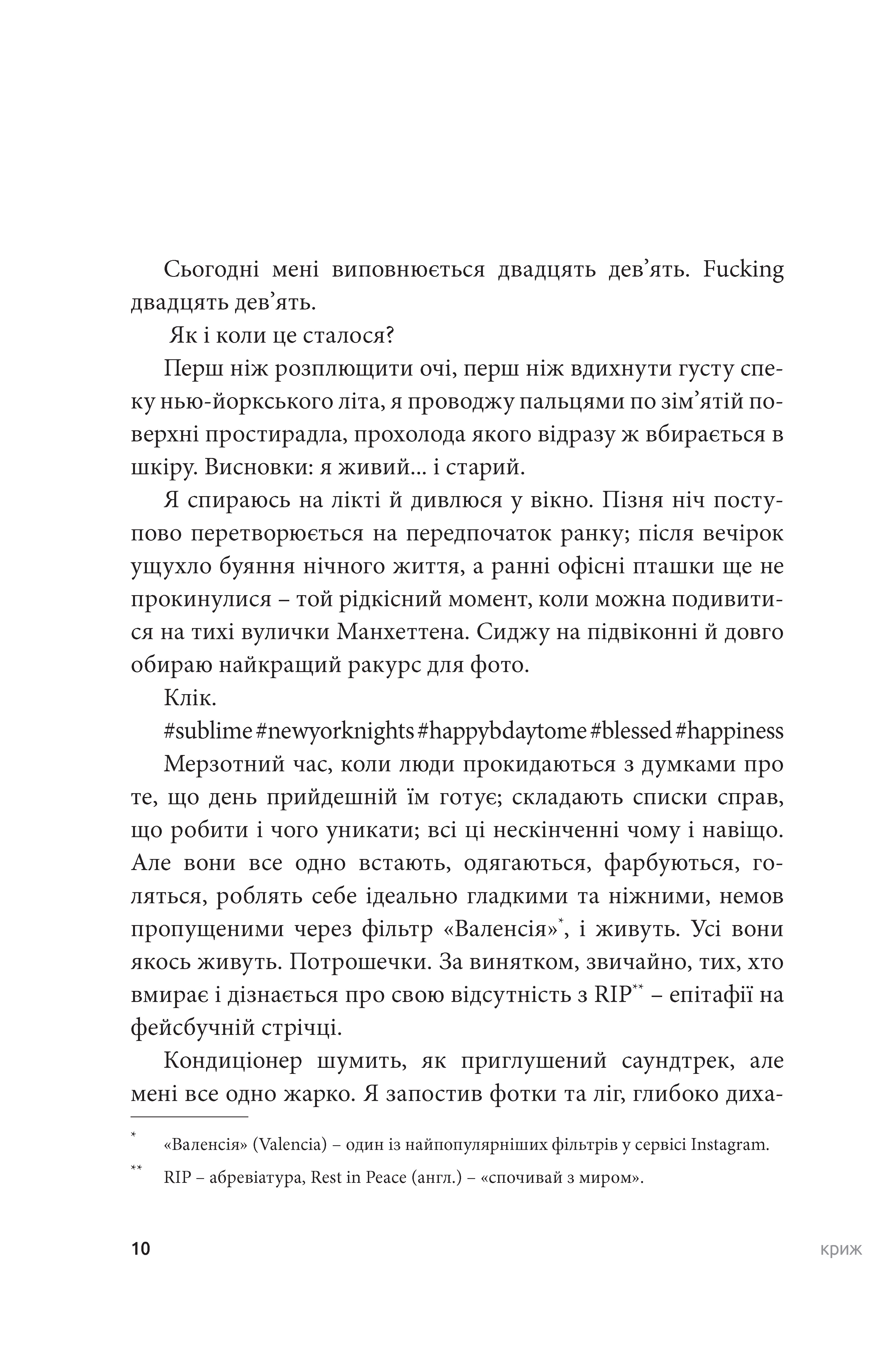 Пригодницький роман-детектив, в якому сплетені корупція та наркотики, мільйони доларів, діаманти, кохання та коханки, дикі тварини та підводні човни. Калейдоскоп подій несила відірватися від читання. Червоною ниткою сюжету проходить душевний біль Стасіса Шалтоки, який, доторкнувшись до американської мрії, усвідомив безглуздість життя в її інстаграмному відображенні. 30 років – свого роду рубіж, який здається йому краєм, за який страшно заглядати. «Не померти до тридцяти», – пише він у своєму to-do list.